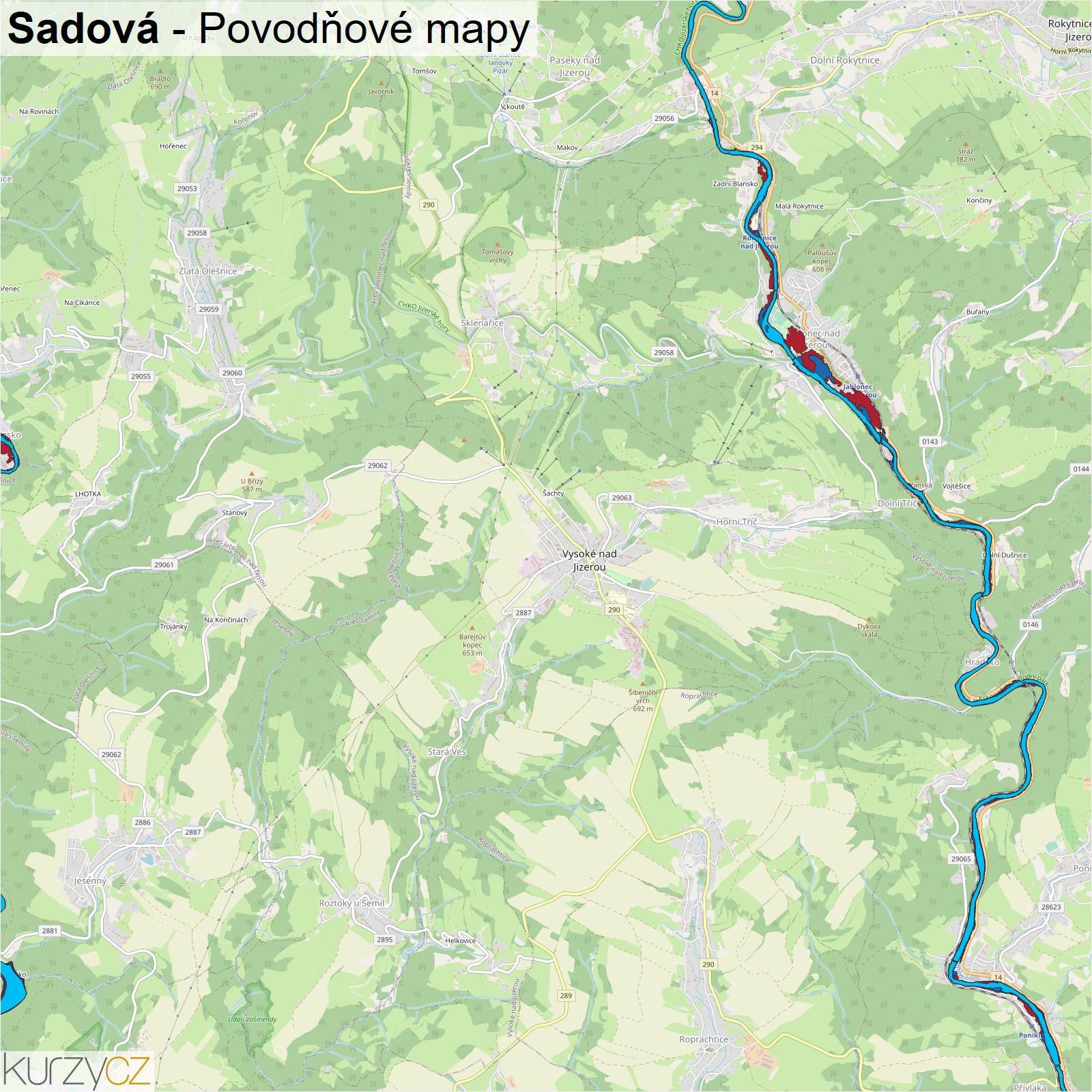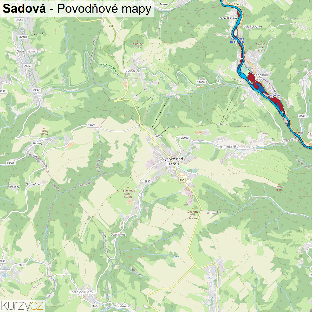 Záplavová mapa ulice Sadová